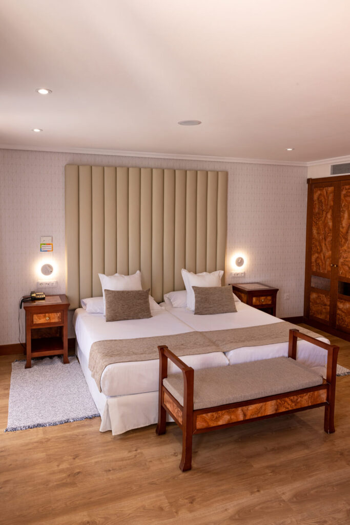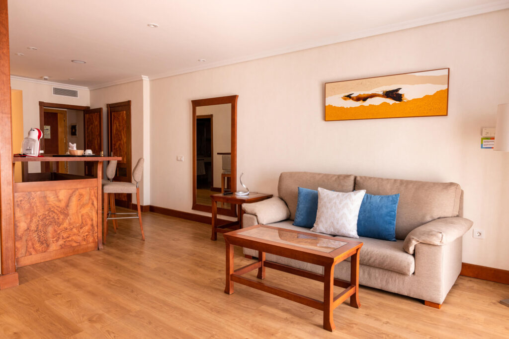 Las Suites con vistas a la montaña, se sitúan en la séptima planta de nuestro edificio principal. Se trata de una de las mejores opciones para quienes buscan una estancia para 2 personas y desean convertir su estancia en una experiencia superior. Nuestras Suites vista montaña se definen por ser un espacio tranquilo y acogedor para unas vacaciones en pareja en Tenerife Sur. Dispone de 2 camas individuales, armarios, televisión por satélite, utensilios para café y té, aire acondicionado, nevera, minibar (bajo pedido) y baño con secador, ducha independiente y bañera de hidromasaje de 2 plazas. También disponemos de camas balinesas bajo disponibilidad para nuestras Suites de la séptima planta. Todos los detalles han sido pensados para crear el mejor ambiente posible para el disfrute de unas vacaciones a la altura en Tenerife.